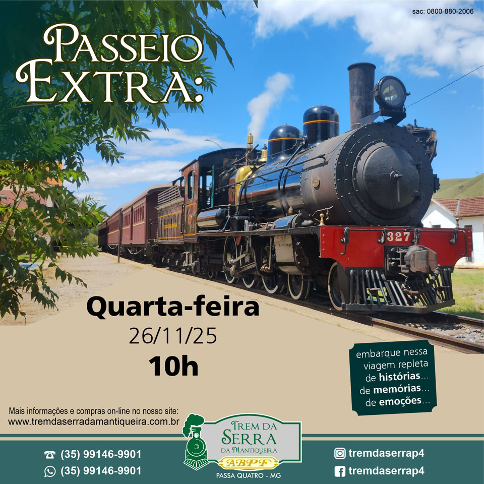 Ou se preferir faça a sua reserva pelo telefone (35) 99146-9901 (WhatsApp) (atendimento de terça-feira a sexta-feira: 9h às 17h; sábado: de 8h às 17h; domingo: 8h às 13h) ou pelo e-mail: tremdaserrap4@abpf.com.br