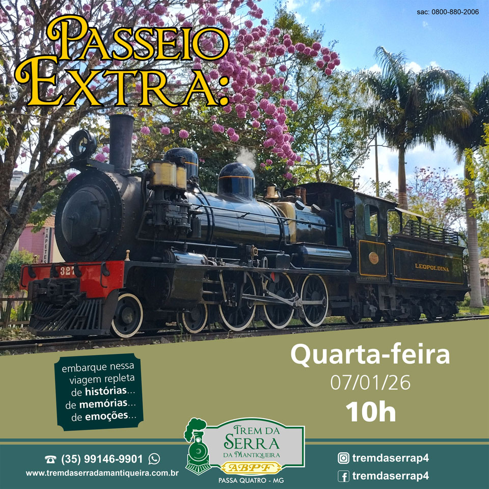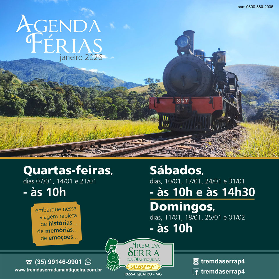 Ou se preferir faça a sua reserva pelo telefone (35) 99146-9901 (WhatsApp) (atendimento de terça-feira a sexta-feira: 9h às 17h; sábado: de 8h às 17h; domingo: 8h às 13h) ou pelo e-mail: tremdaserrap4@abpf.com.br
