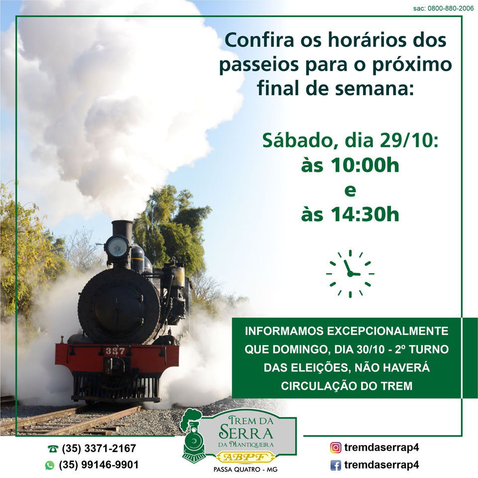 Ou se preferir faça a sua reserva pelo telefone (35) 3371–2167 ou (35) 99146-9901 (WhatsApp) (horário comercial e finais de semana) ou pelo e-mail: tremdaserrap4@abpf.com.br