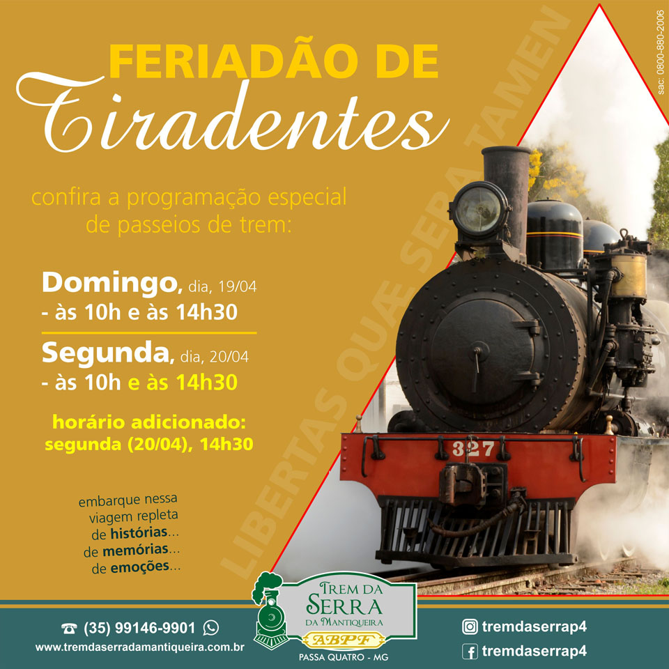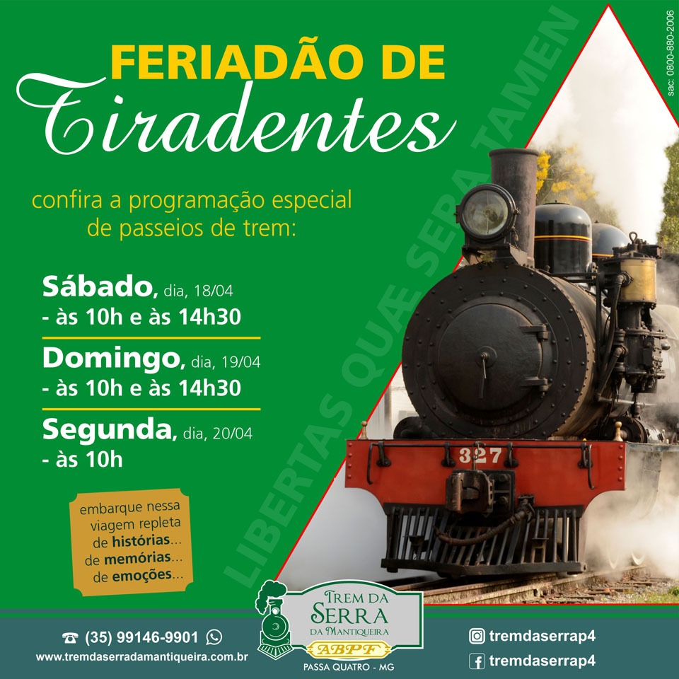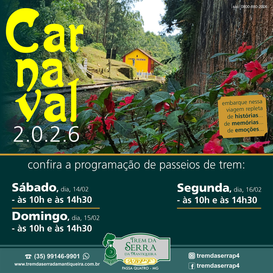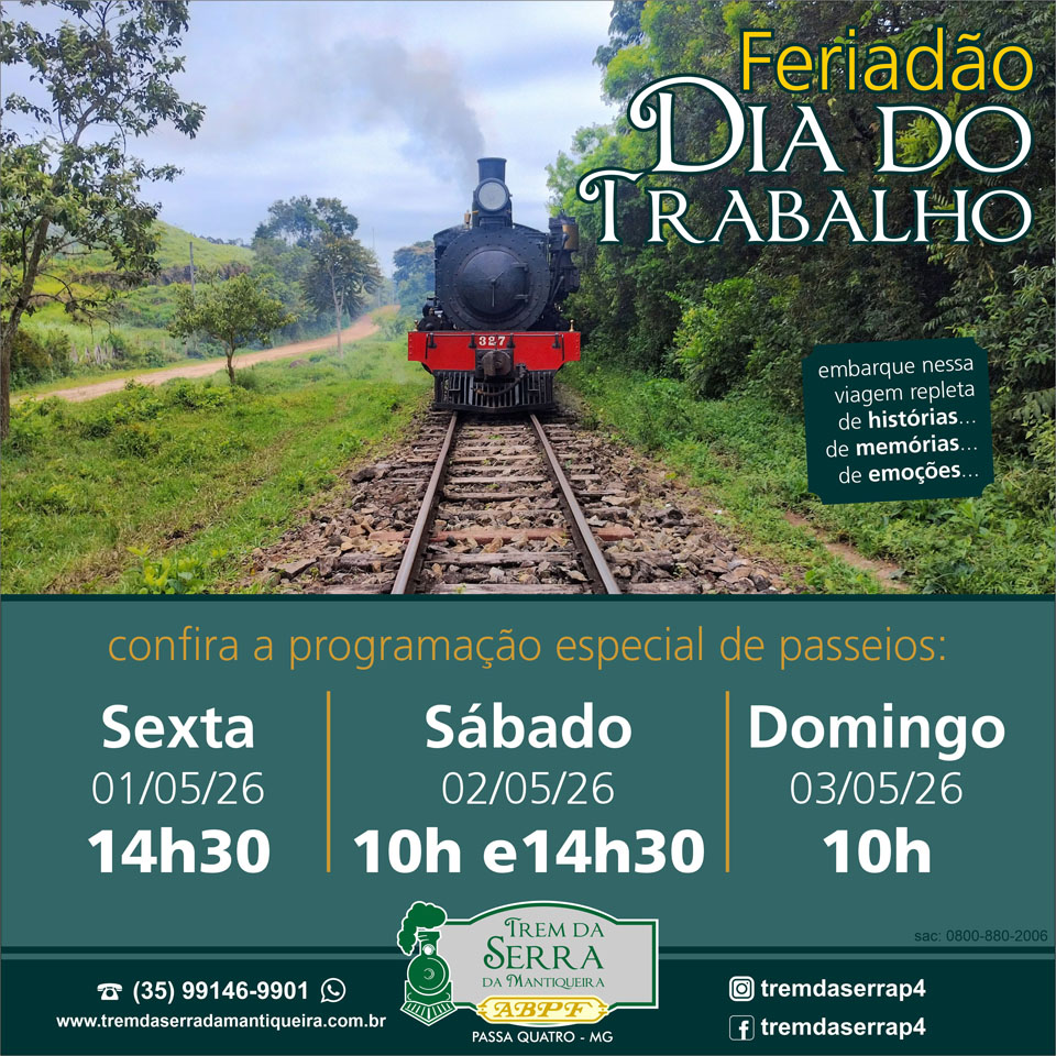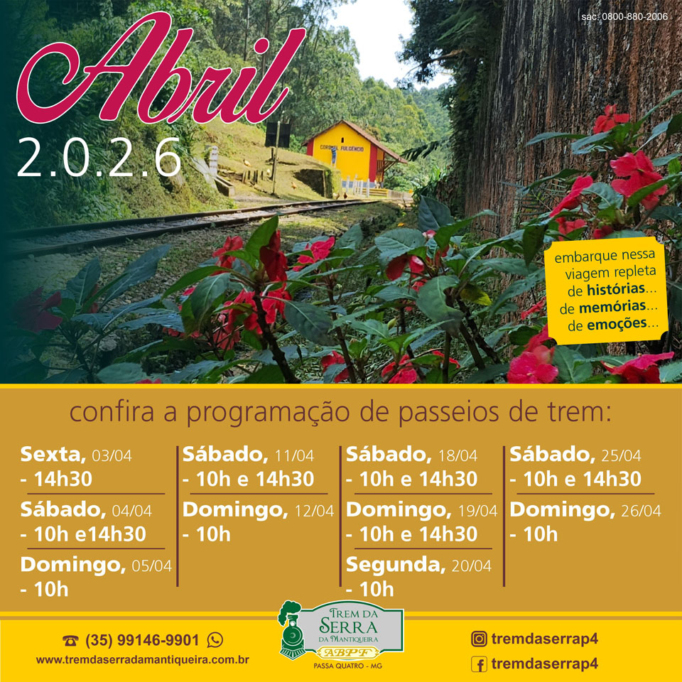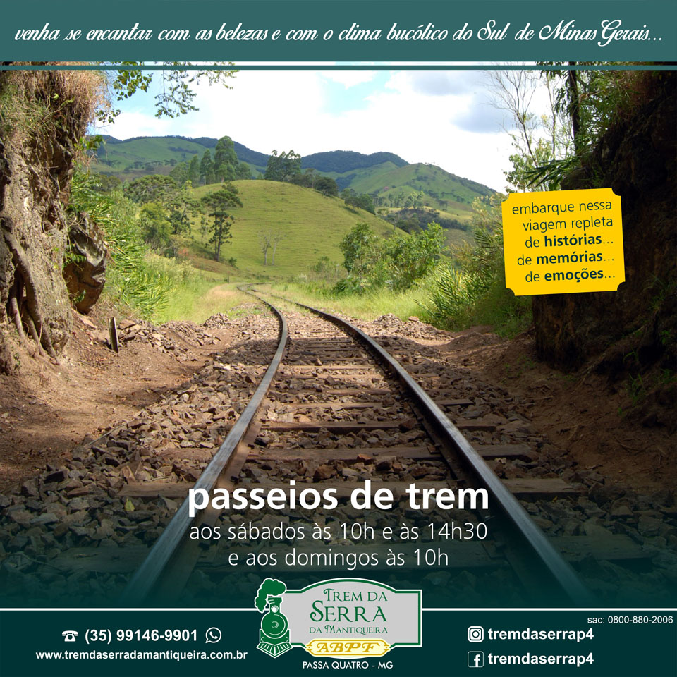 Ou se preferir faça a sua reserva pelo telefone (35) 99146-9901 (WhatsApp) (atendimento de terça-feira a sexta-feira: 9h às 17h; sábado: de 8h às 17h; domingo: 8h às 13h) ou pelo e-mail: tremdaserrap4@abpf.com.br